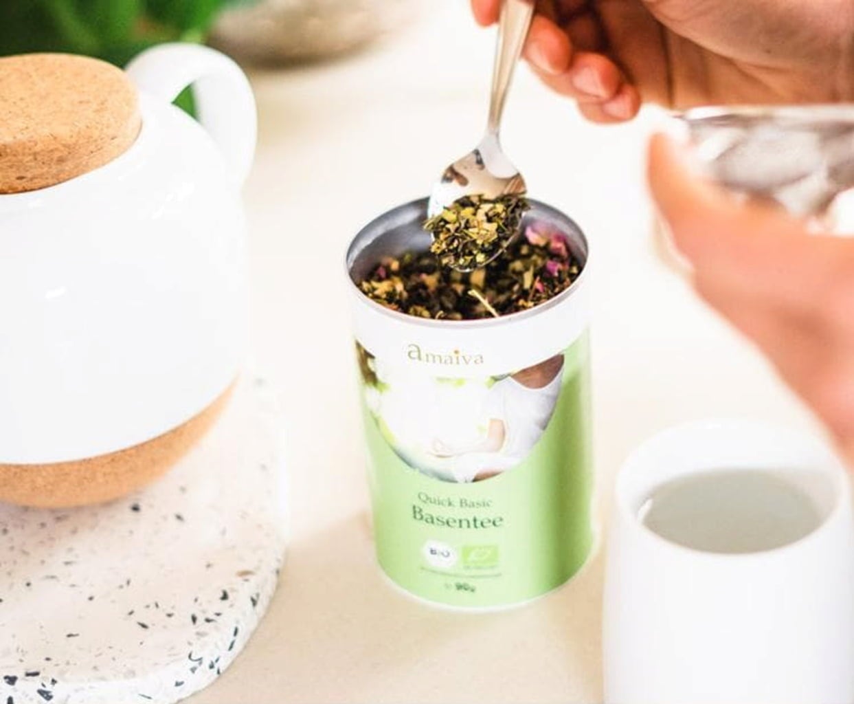 The basic tea is a carefully composed blend of green tea, white tea and selected herbs and leaves from controlled organic cultivation. The combination produces an aromatic infusion that is ideal for daily tea enjoyment. The finely balanced recipe creates a well-balanced tea flavour.