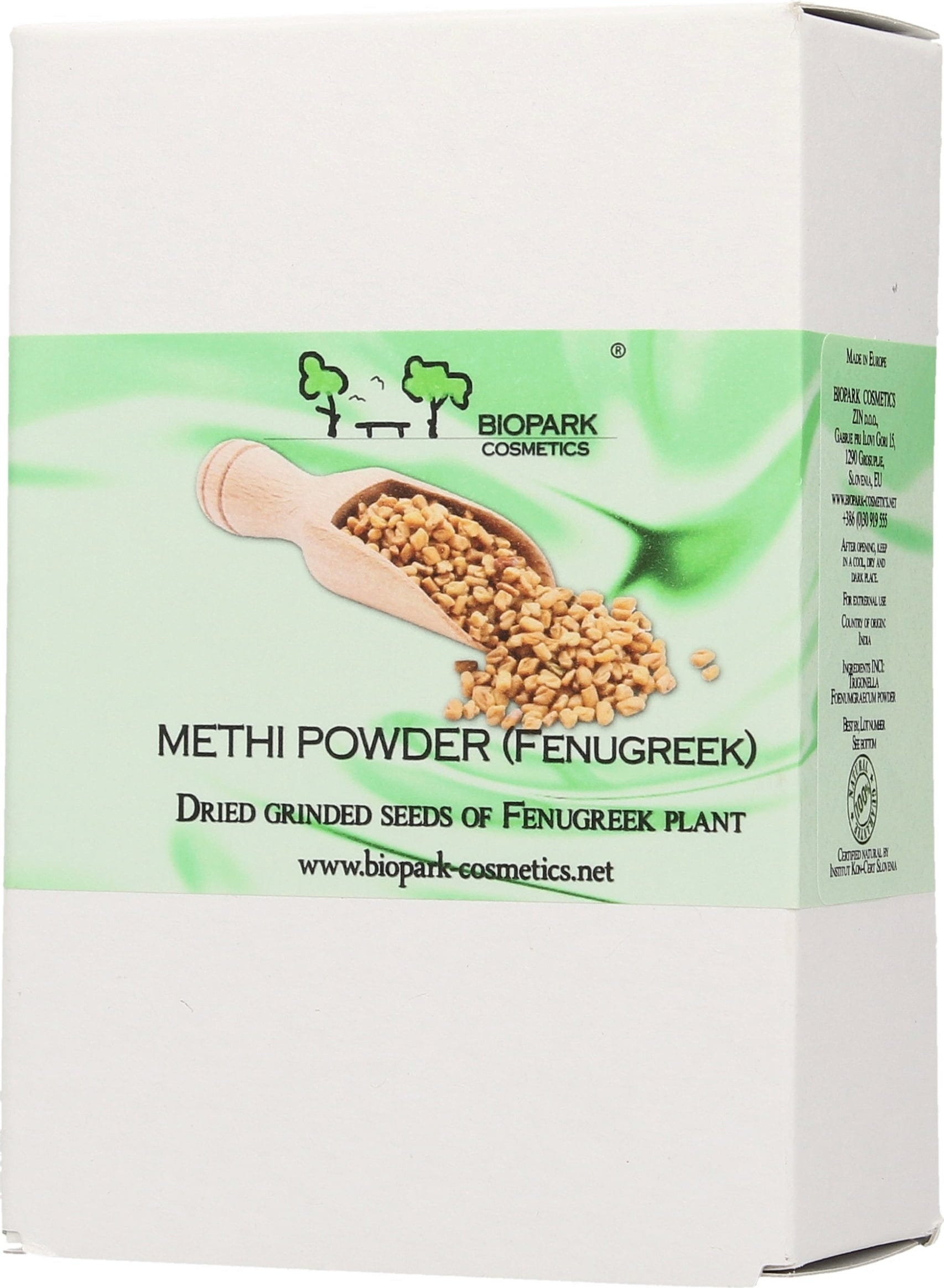 Methi (Indian: fenugreek seed) powder is incorporated into skincare due to its ability to soothe itchiness and irritations. It is often used for irritated and inflamed skin, dandruff and premature hair loss. Fenugreek seed powder activates cell renewal and healthy hair growth. It is also beneficial when it comes to wounds, atopic dermatitis, fine wrinkles and age spots. When used as a face mask, it absorbs excess sebum leaving the skin flawless and radiant.