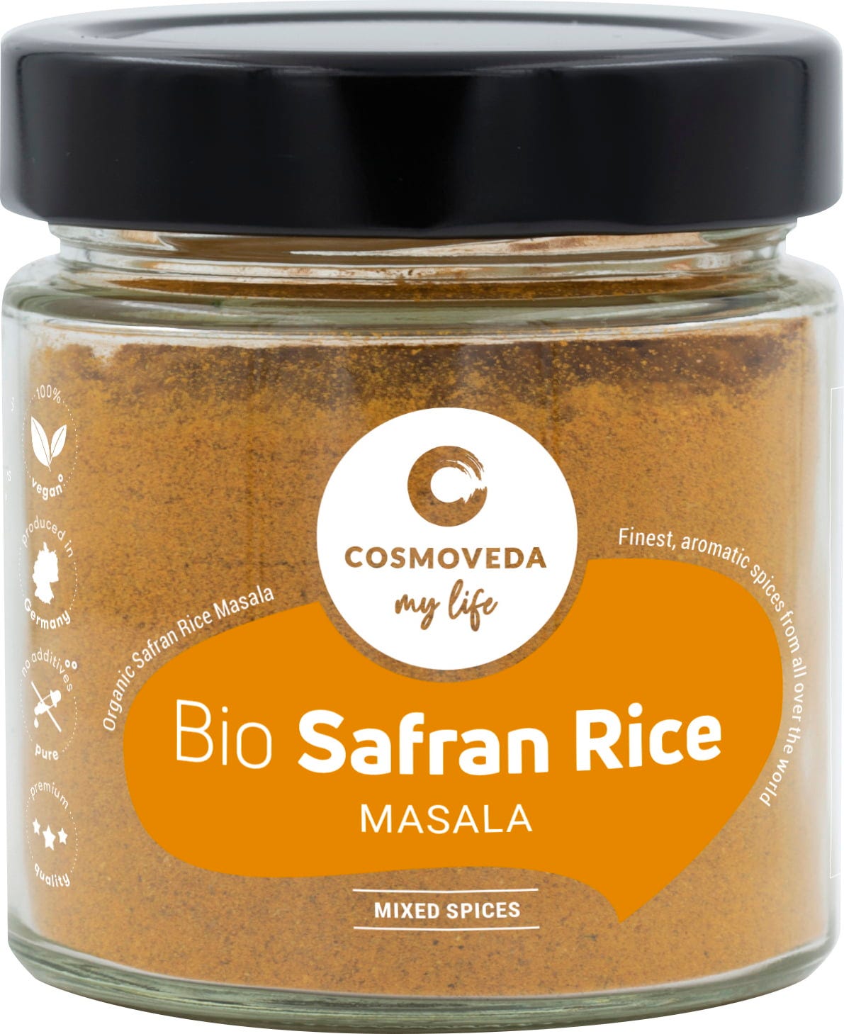 COSMOVEDA Organic Saffron Rice Masala, a specially formulated Ayurvedic blend of fine spices to conjure up a delicious saffron rice. Add a pinch of masala to the boiling water, or gently fry the masala in sunflower oil or ghee before cooking, add and stir the rice until it is covered with the colour of spices and cooking in hot water.