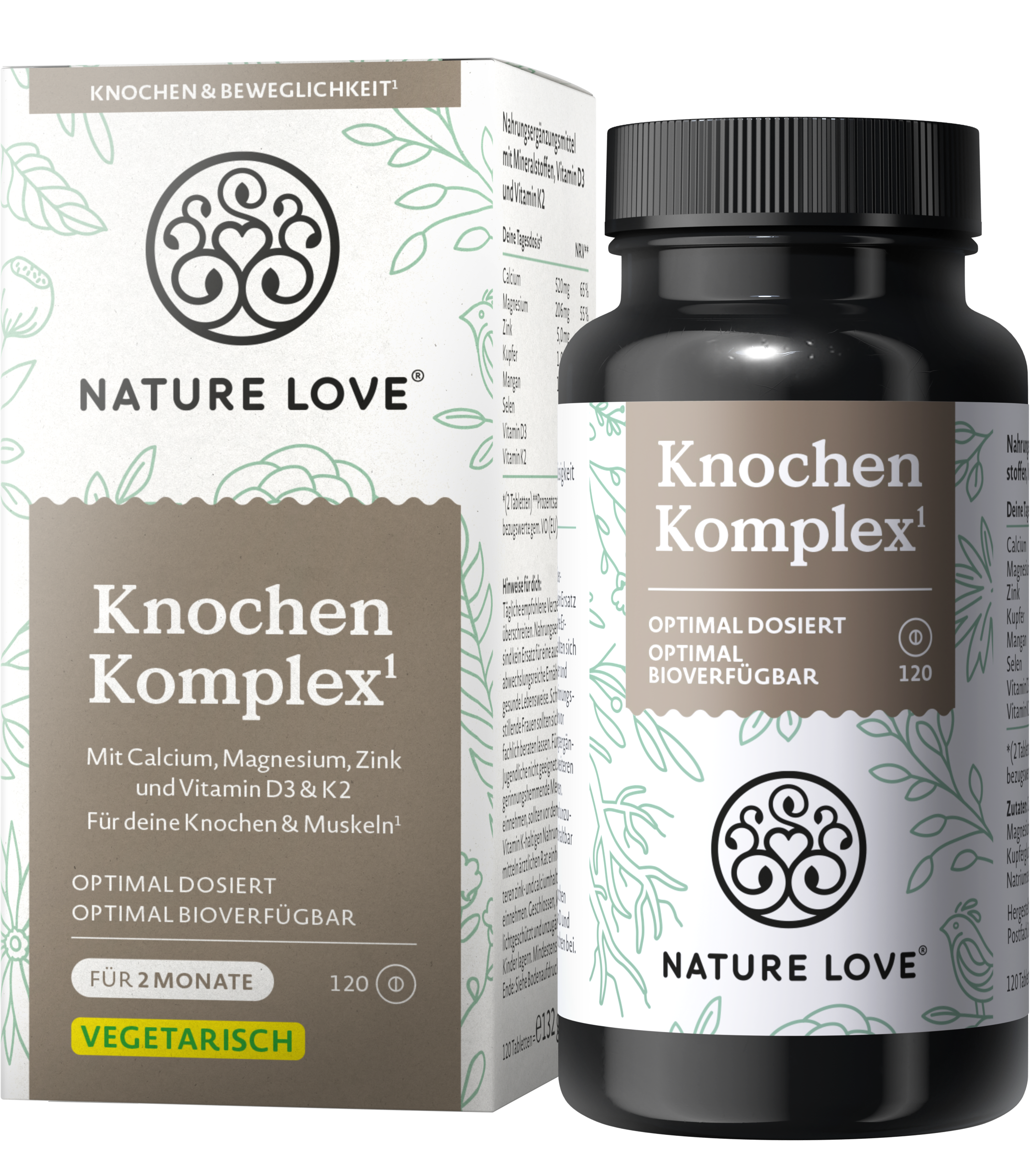 Your bones and muscles work hard every day and play a vital role in your life. Nature Love's Bone Complex tablets contain a valuable mixture of nutrients that optimally support your body. The formulation is enriched with calcium, magnesium, zinc, selenium, copper and manganese as well as vitamins D3 and K2.