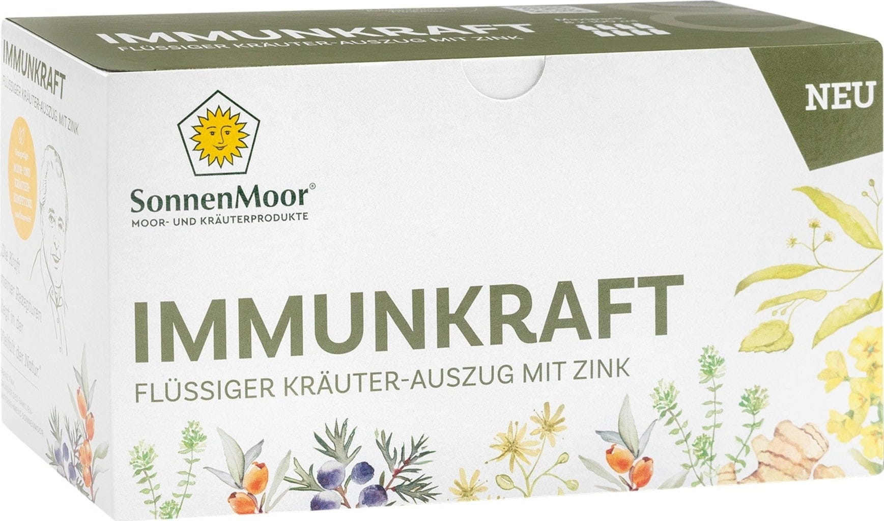 Immunkraft from SonnenMoor is a purely plant-based product that combines twelve carefully selected botanicals, berries, and roots in liquid form. The formula is based on traditionally valued plants such as lime blossom, thyme, rosehip, and elderflower. This blend is further enhanced by high-quality ginger and turmeric roots, as well as the essential mineral zinc.